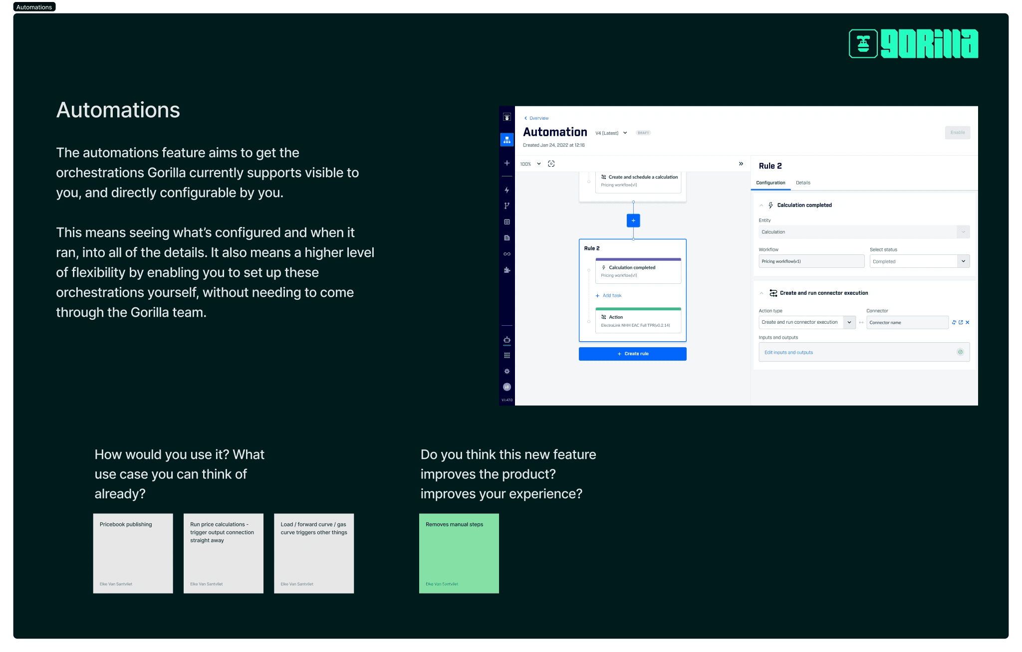 The goal of this feature was to empower and enable our users to control and manipulate the processes in their Gorilla setup. Automations allow users to set repetitive or one-time flows and tailor the platform to work according to their needs. In-app automation/orchestration configuration will provide a way to chain actions after each other and make decisions based on the result of the previous one.